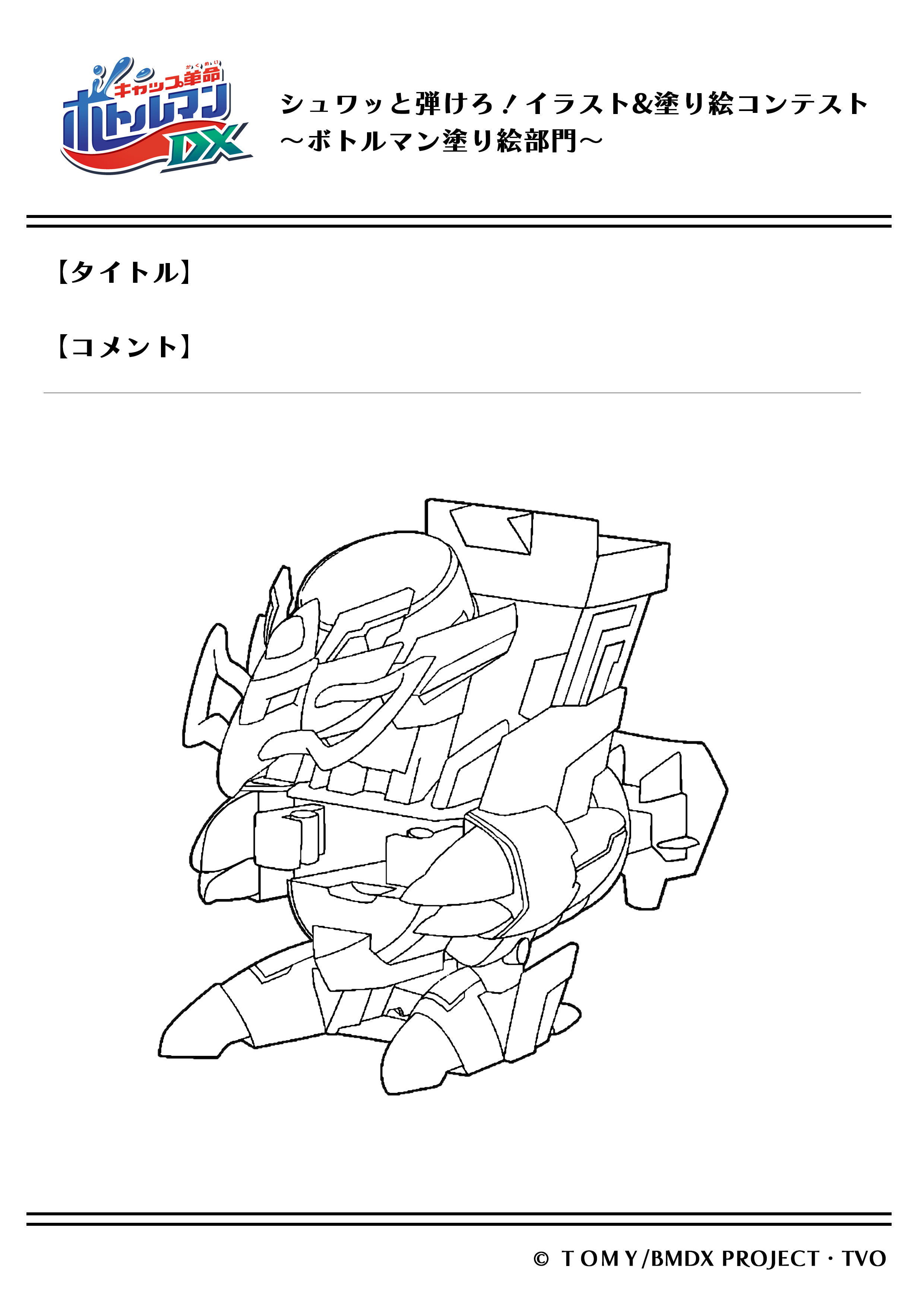 ・『キャップ革命 ボトルマンDX』公式HP・公式Twitterで、本コンテスト用に配布される塗り絵用データをご利用の上、自由に色を塗ってください。